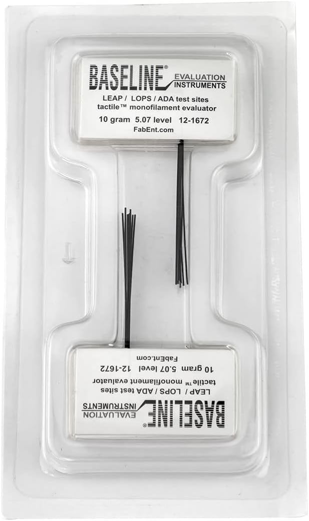 The FEI Baseline Tactile Monofilament is a specialized diagnostic tool used for evaluating tactile sensation. Each monofilament is designed to deliver a precise force of 10 grams (5.07 level) when applied correctly, adhering to ADA, LEAP, and LOPS program testing protocols. This product is supplied in a pack of 20 disposable monofilaments.