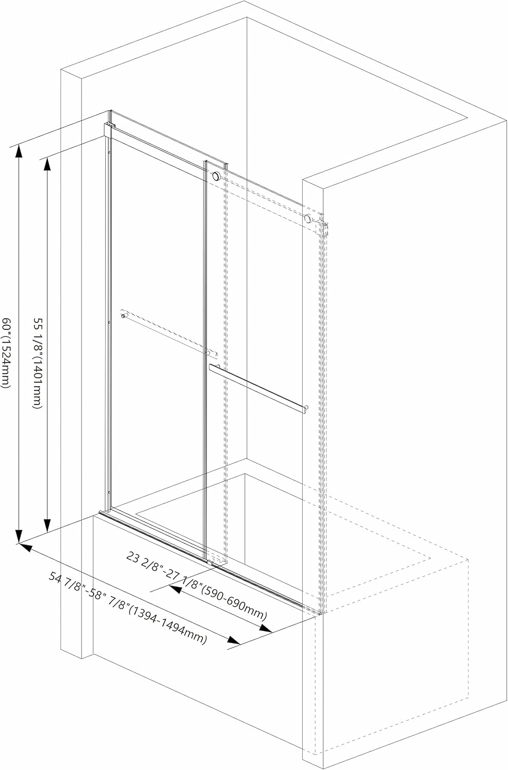This diagram illustrates the adjustable width of the shower door, showing the overall dimensions and how to measure your space for a proper fit.