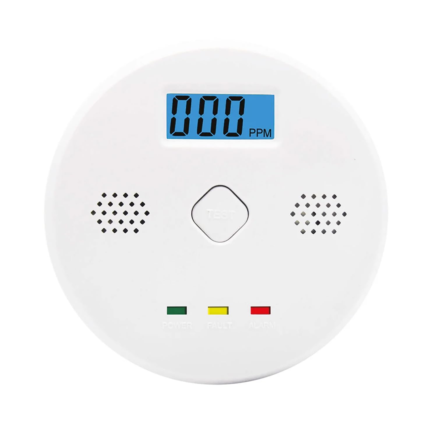 איור 1: חֲזִית view of the GBC iSnatch Carbon Monoxide Detector. It features a central digital display showing PPM (parts per million) of CO, a 'TEST' button, and three indicator lights at the bottom: 'POWER' (green), 'FAULT' (yellow), and 'ALARM' (red). Speaker grilles are visible on both sides of the display.