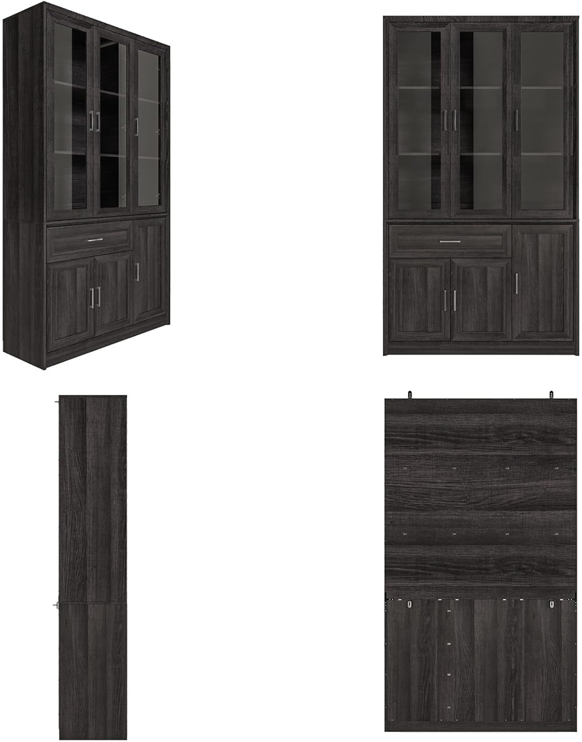 This display cabinet features a farmhouse style with a black-grey wood grain finish, three glass doors, and a drawer, offering ample storage and display space for collectibles, trophies, and books.