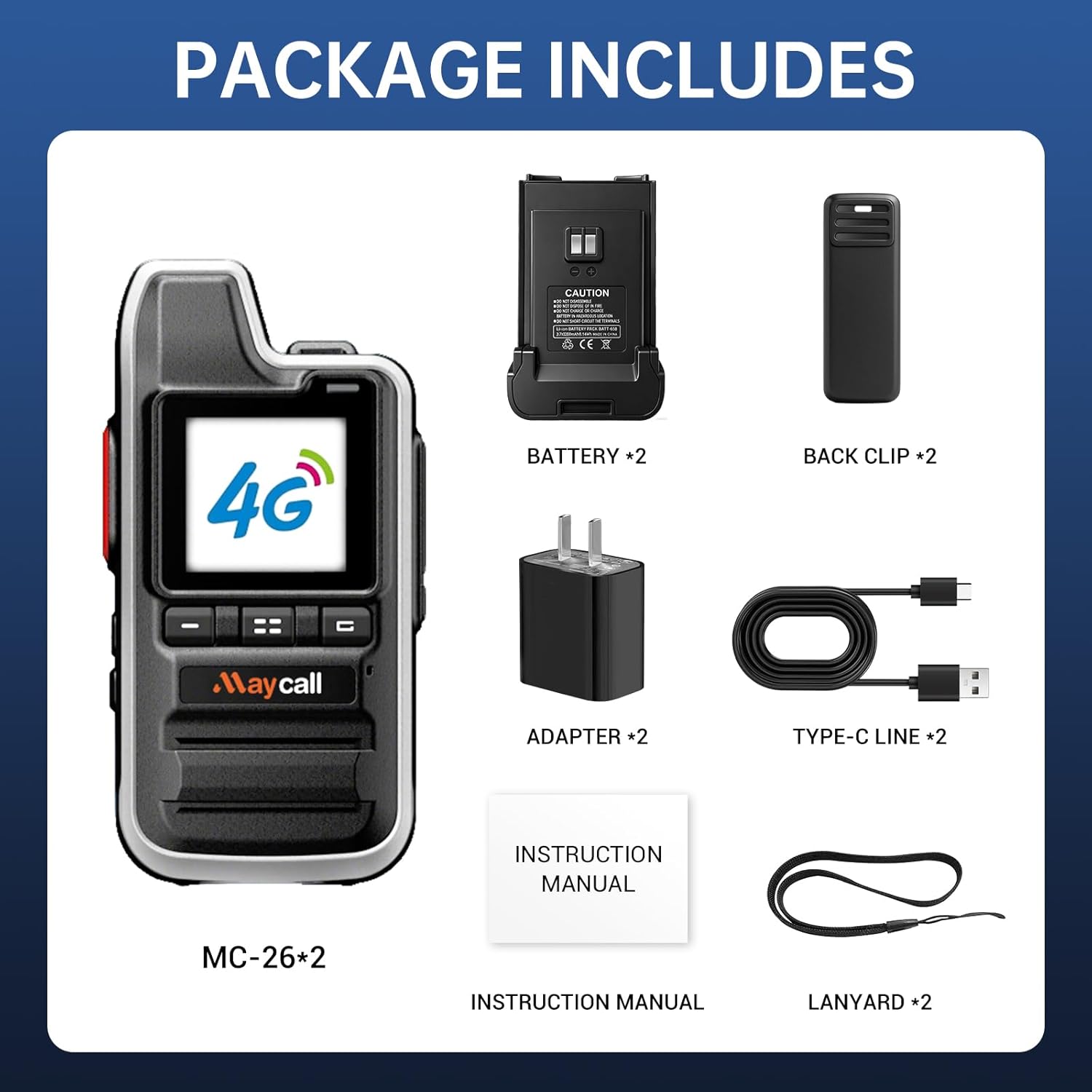 The Maycall MC-26 Global Walkie Talkies provide reliable and extensive communication capabilities. Utilizing advanced 2G/3G/4G LTE and dual-mode technology, these two-way radios offer an ultra-long transmission range, ensuring connectivity in diverse environments. Designed for clarity and privacy, they feature secure encrypted calls, crystal-clear audio with noise reduction, and support for both individual and group communication. The devices are powered by a long-lasting 3000mAh battery and come with a lifetime service SIM card, eliminating recurring fees.