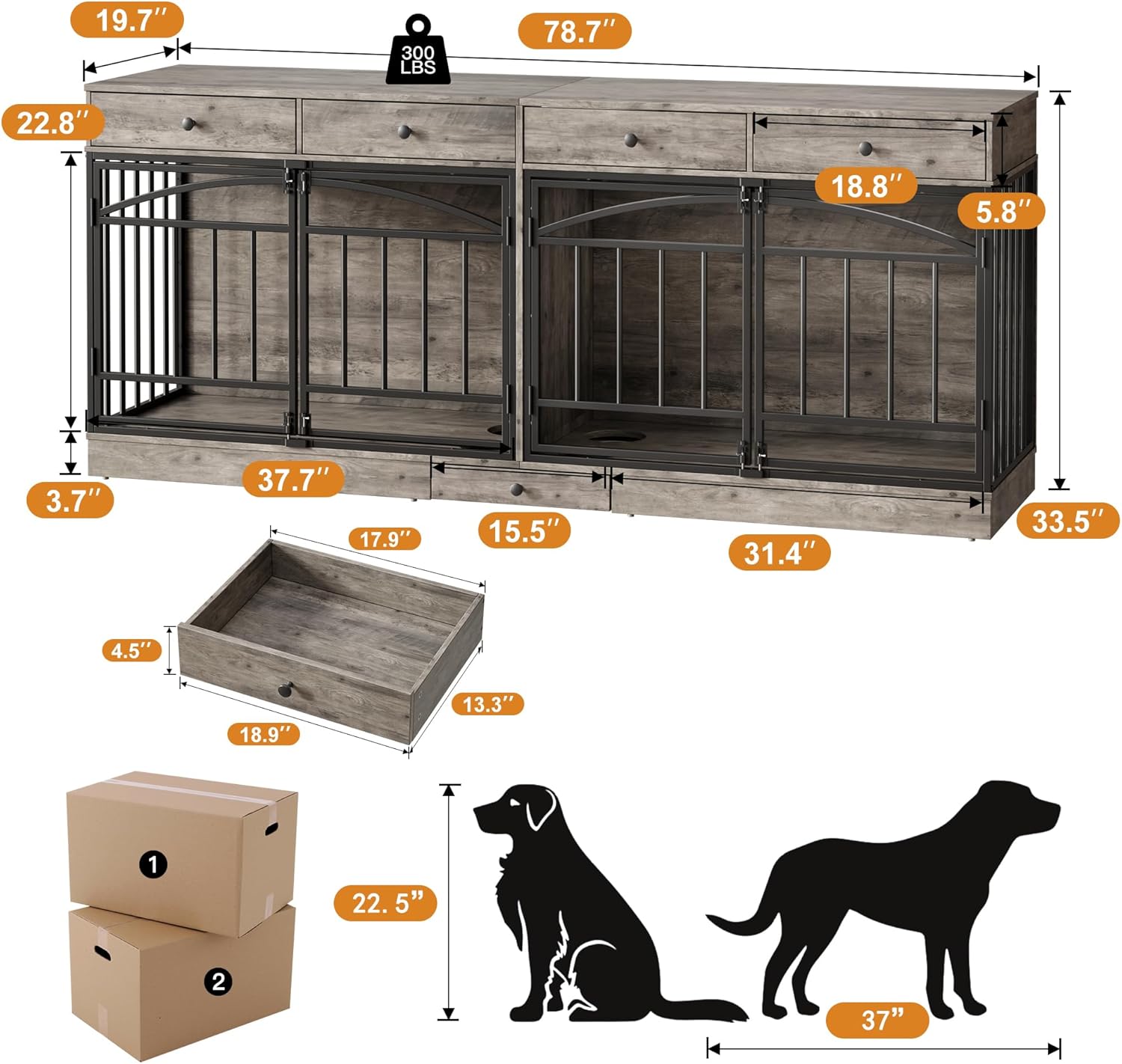 The unit features two spacious dog crate compartments, each with two doors secured by metal latches. These provide a safe and comfortable space for your small to medium-sized dogs.