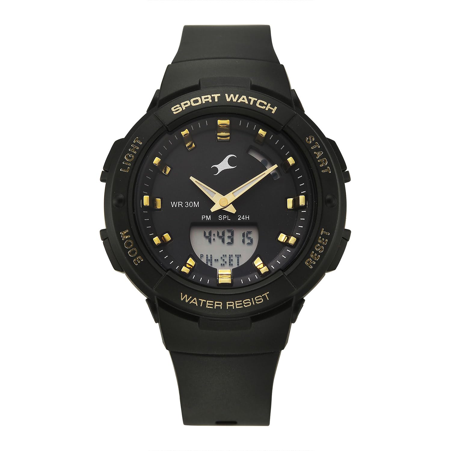 This image displays the front of the Fastrack StreetStyle 5.0 watch, highlighting its black dial, gold-tone hour markers, and both analog and digital time displays. The four control buttons (LIGHT, MODE, START, RESET) are visible on the sides of the case.